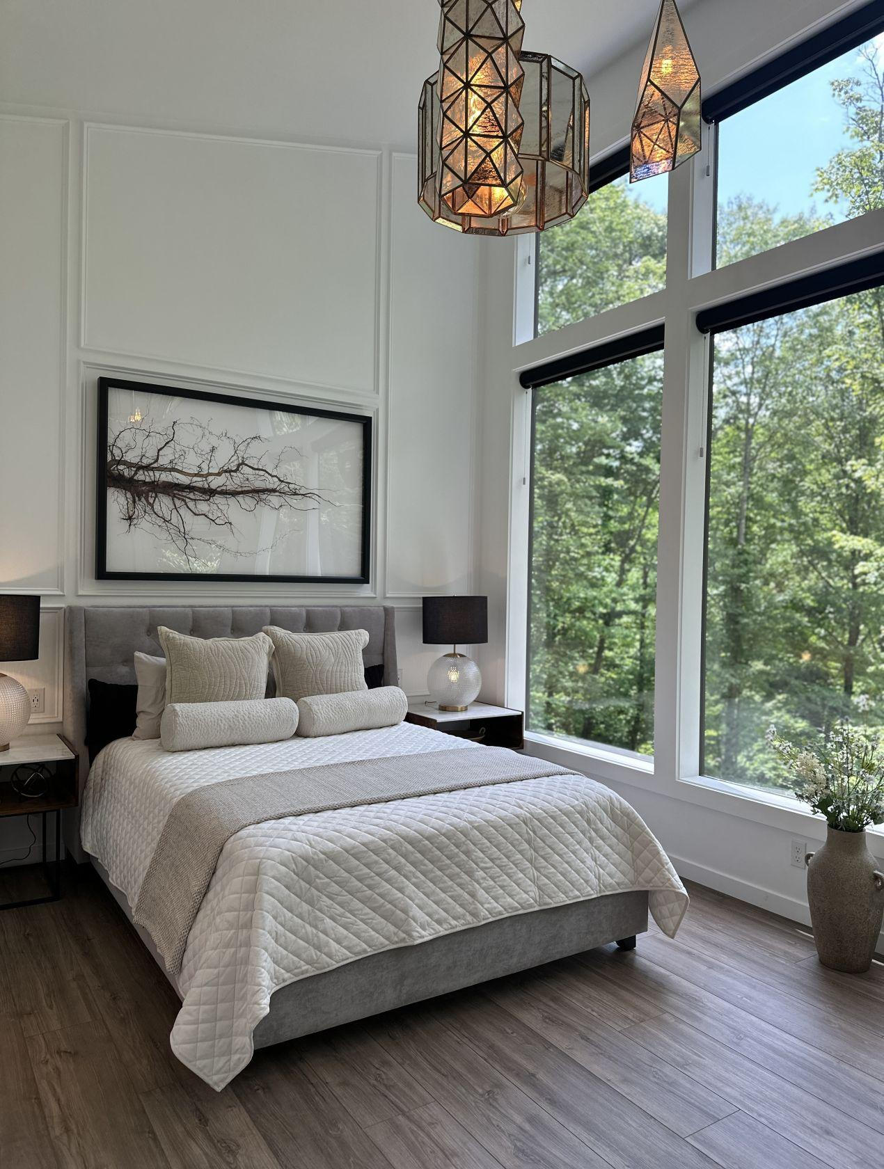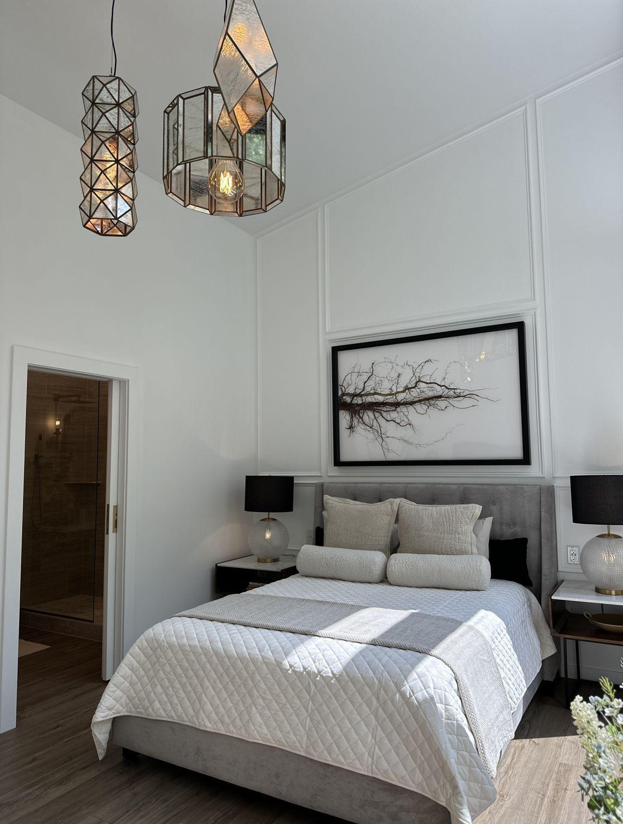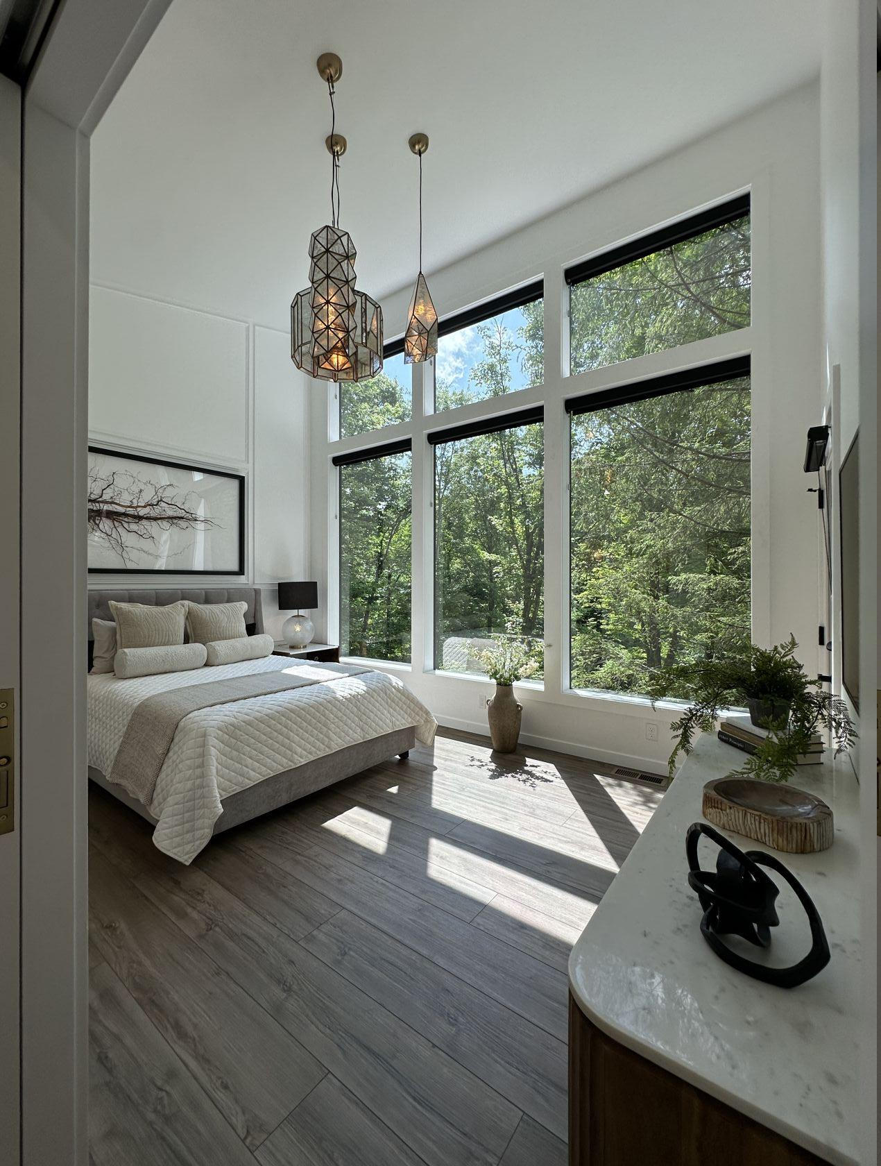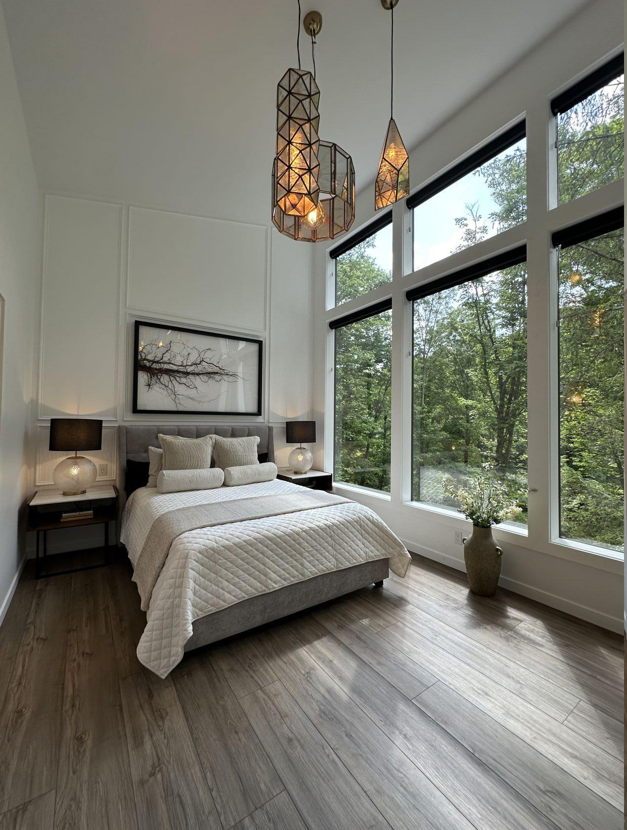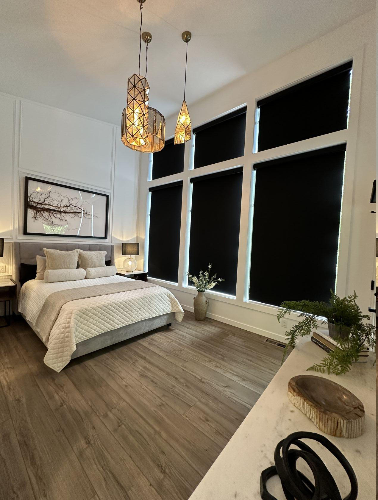 The large open bedroom design features floor to ceiling windows with remote control blackout blinds for those early mornings. The spacious bathroom and beautiful shower is just steps away with a pocket door for easy access.