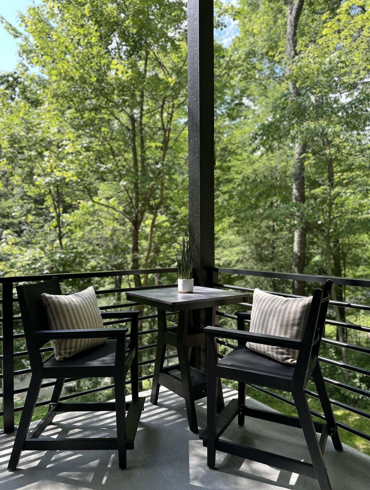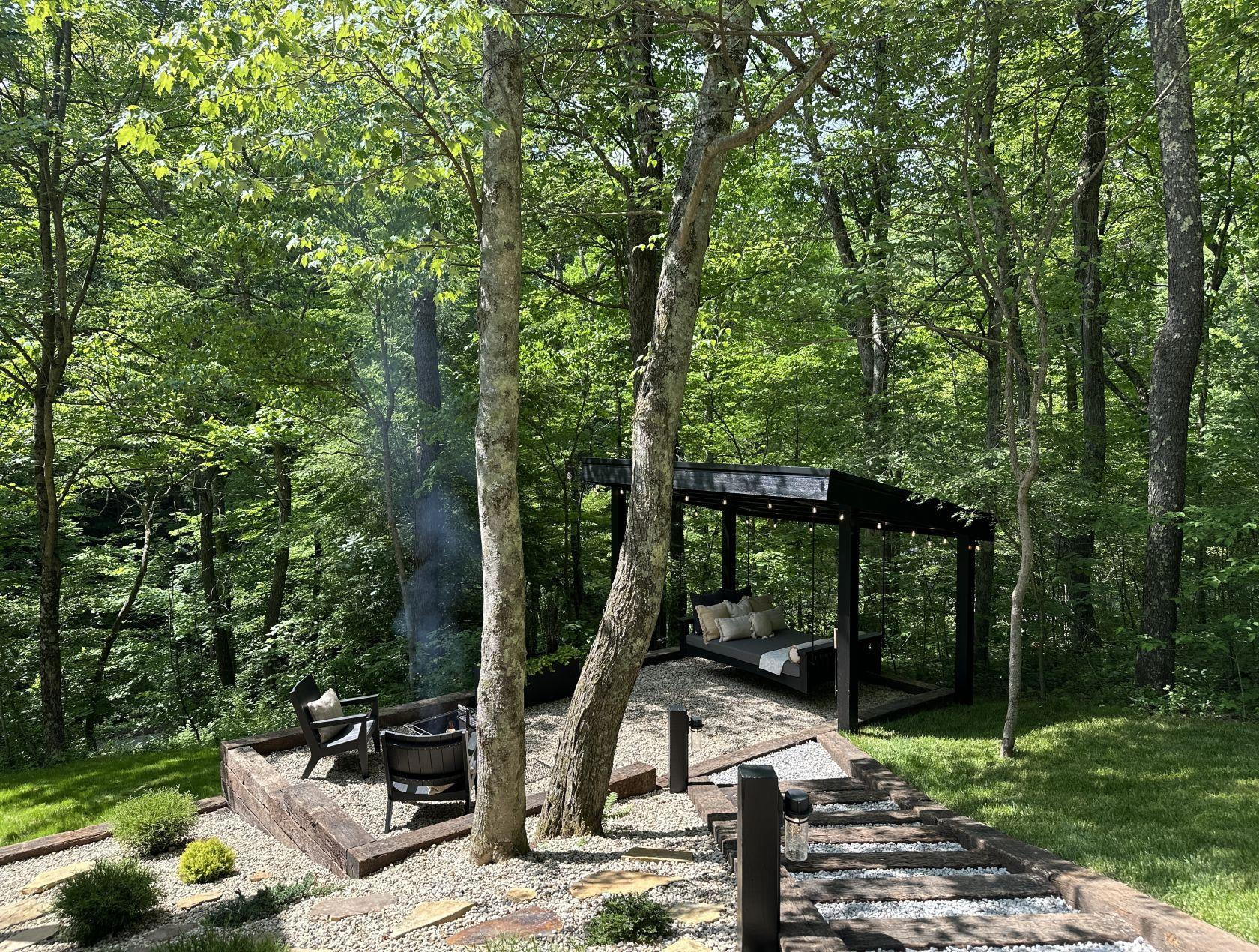 The attention to detail is a staple here at Creative-Cabins and for Kobe’s, we decided to give you even more. The eat-in bar area has a great view of the outdoors, along with the view out the big kitchen window of our beautiful covered outdoor bed for two. Follow the stairs down to the fire pit and our outdoor bed for yet another cozy area here at Kobe’s Cabin.