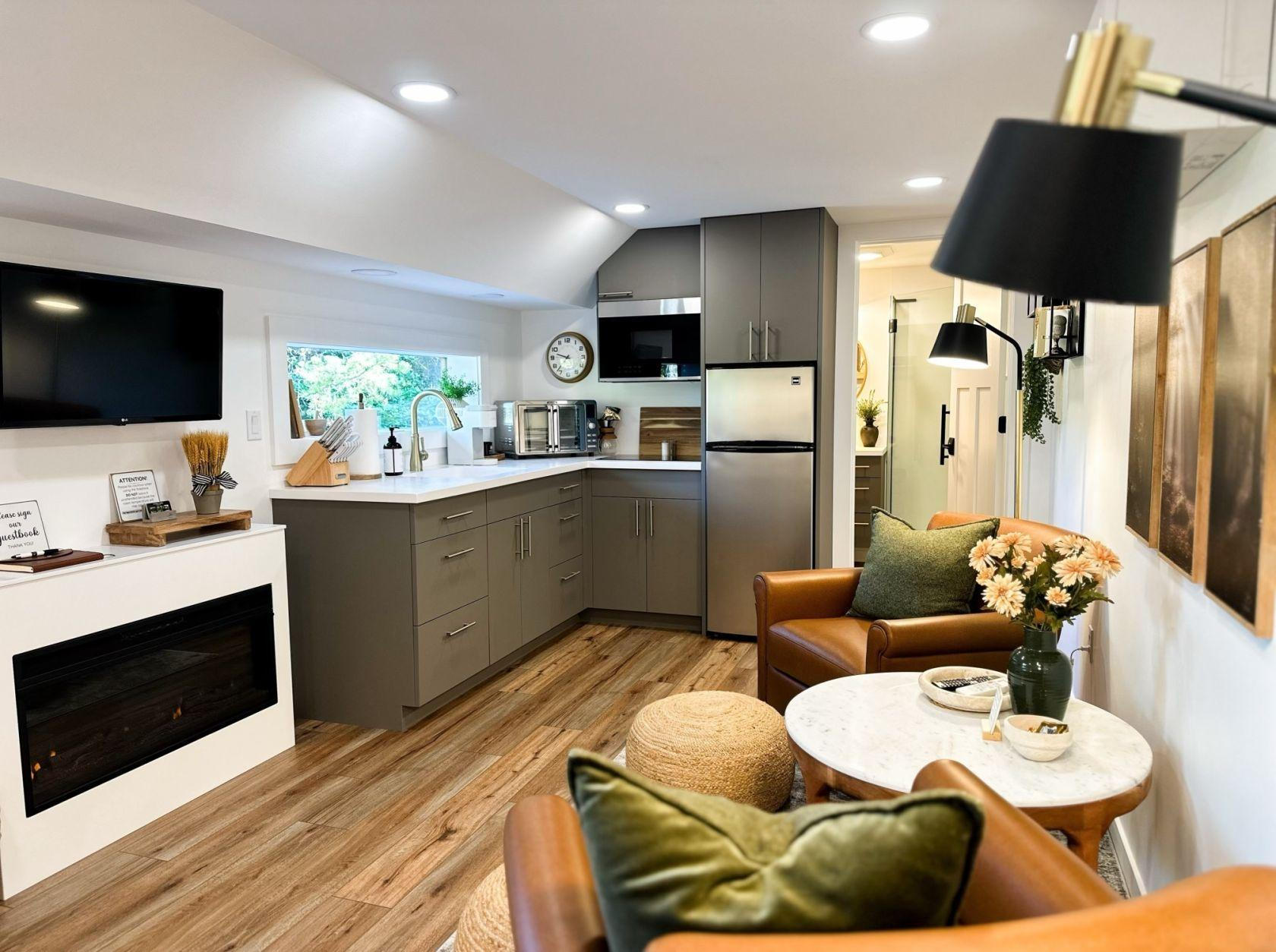 The Hot tub is located in a private section of the hayloft. Full/double size bed, fully operating kitchen with seating area & bathroom with shower.